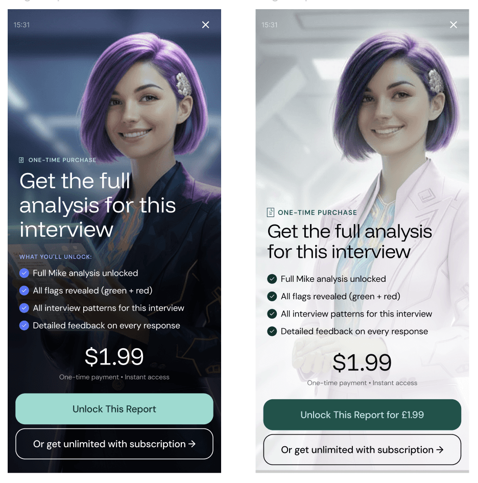 I presented several monetisation directions to the team, focused on aligning upgrade prompts with high-intent moments in the user journey based on research like competitors, other screens, articles about mental models, my knowledge and common sense.