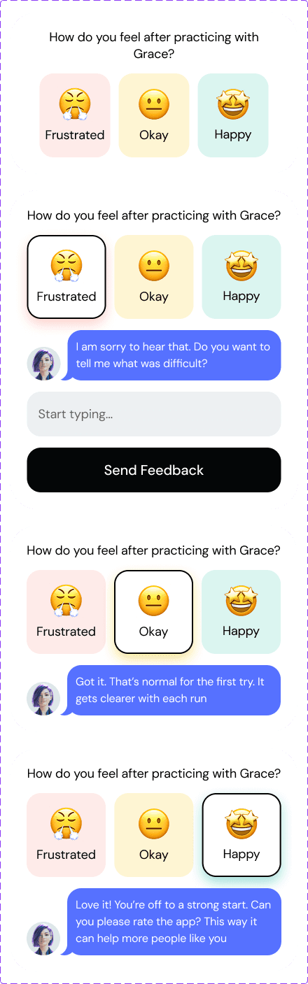 1) If a user is frustrated after an interview, we acknowledge their feelings and sympathise, while also gathering feedback to understand how we can improve the process in the future.